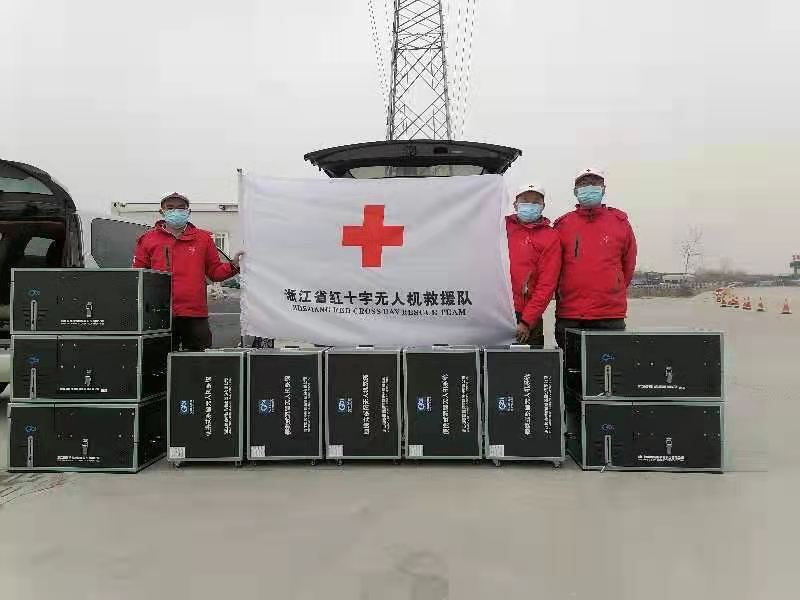 1月14日上午,绍兴市红十字极客桥无人机救援队得知这一情况后立刻与建设单位联系,当天紧急就近调配6台无人机照明设备给予支援,同时当晚3名救援队员再次携带10台无人机照明设备,连夜从绍兴驱车12个小时赶赴河北。由于疫情防控部署要求,救援队队员无法进入建设点,紧急与当地的无人机志愿者取得联系,在山东德州交接无人机照明设备,并委托他们运送到隔离区建设点现场进行操作支援。